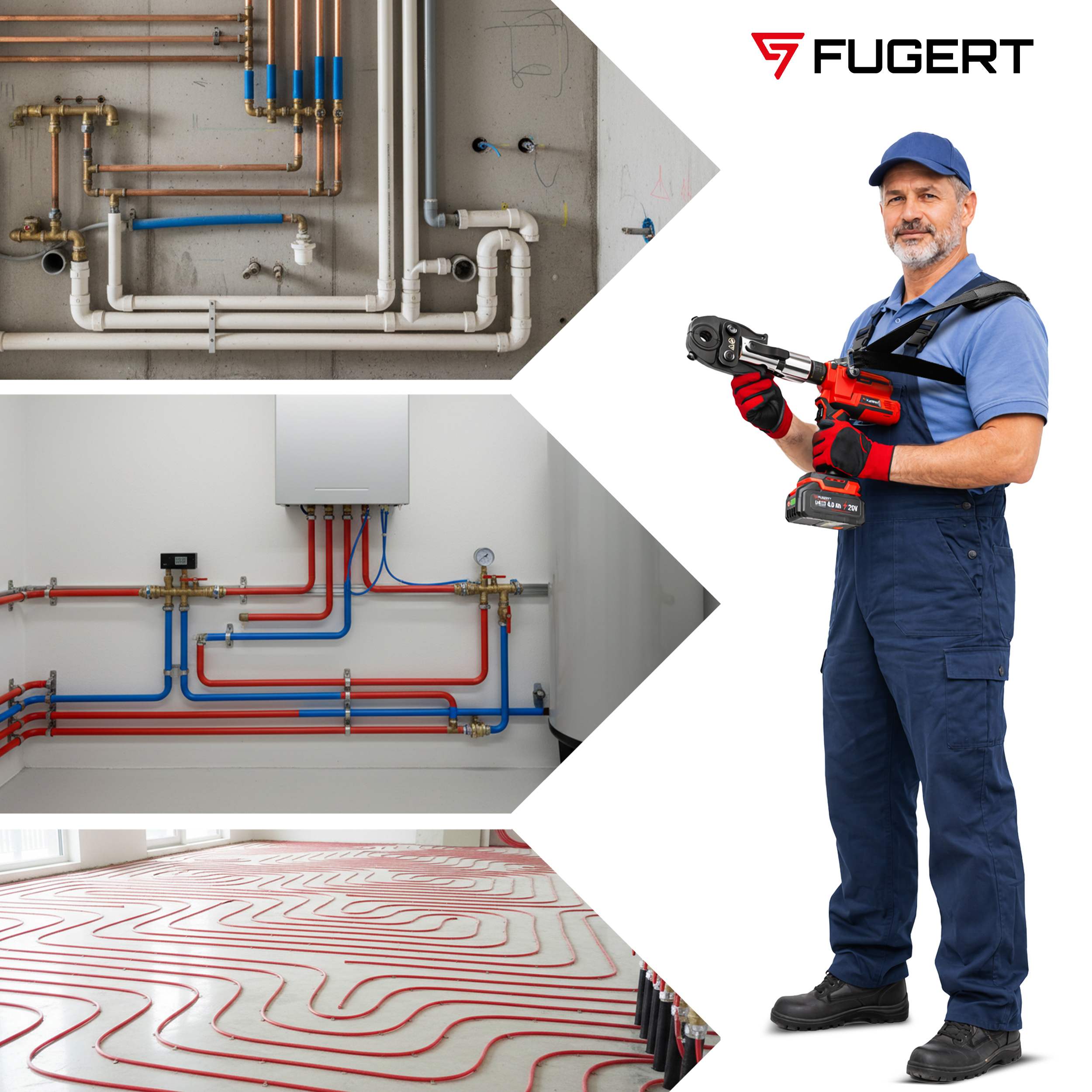 Zaciskarka hydrauliczna FUGERT to zaawansowane narzędzie dla instalatorów, które eliminuje wysiłek fizyczny i gwarantuje 100% szczelności połączeń. Dzięki obrotowej głowicy 360° oraz kompaktowej budowie, praca w ciasnych szachtach, narożnikach czy tuż przy ścianie staje się szybka i wygodna.