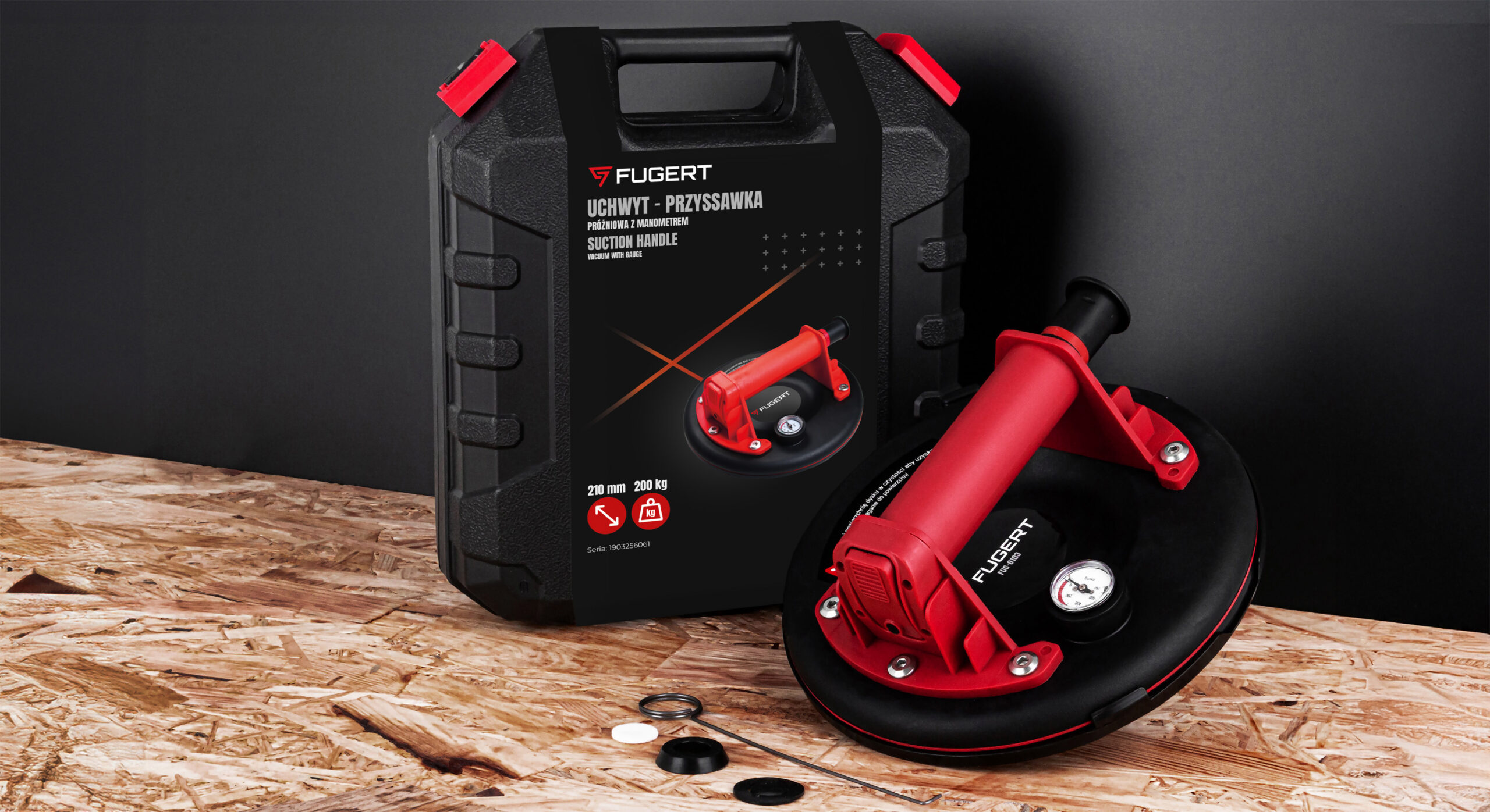 Przyssawka do płytek 210mm o udźwigu 200kg. Wyposażona w czytelny manometr, zawór spustowy i ergonomiczną pompkę.
