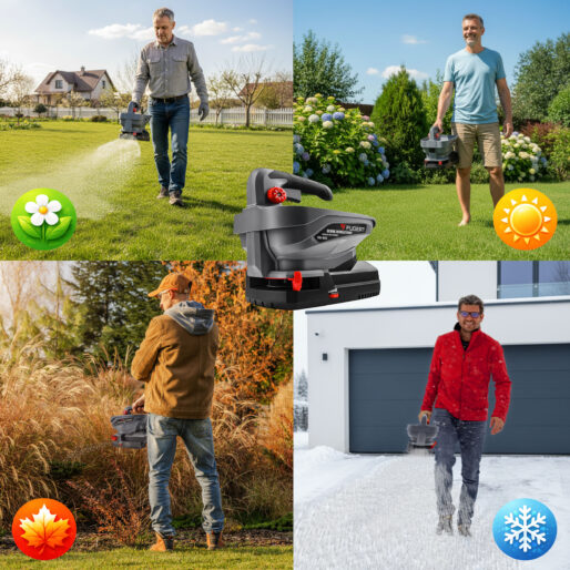 Zima: Niezastąpiony pomocnik w walce z gołoledzią – szybko i równomiernie rozprowadzi sól lub piasek na podjeździe i chodniku.